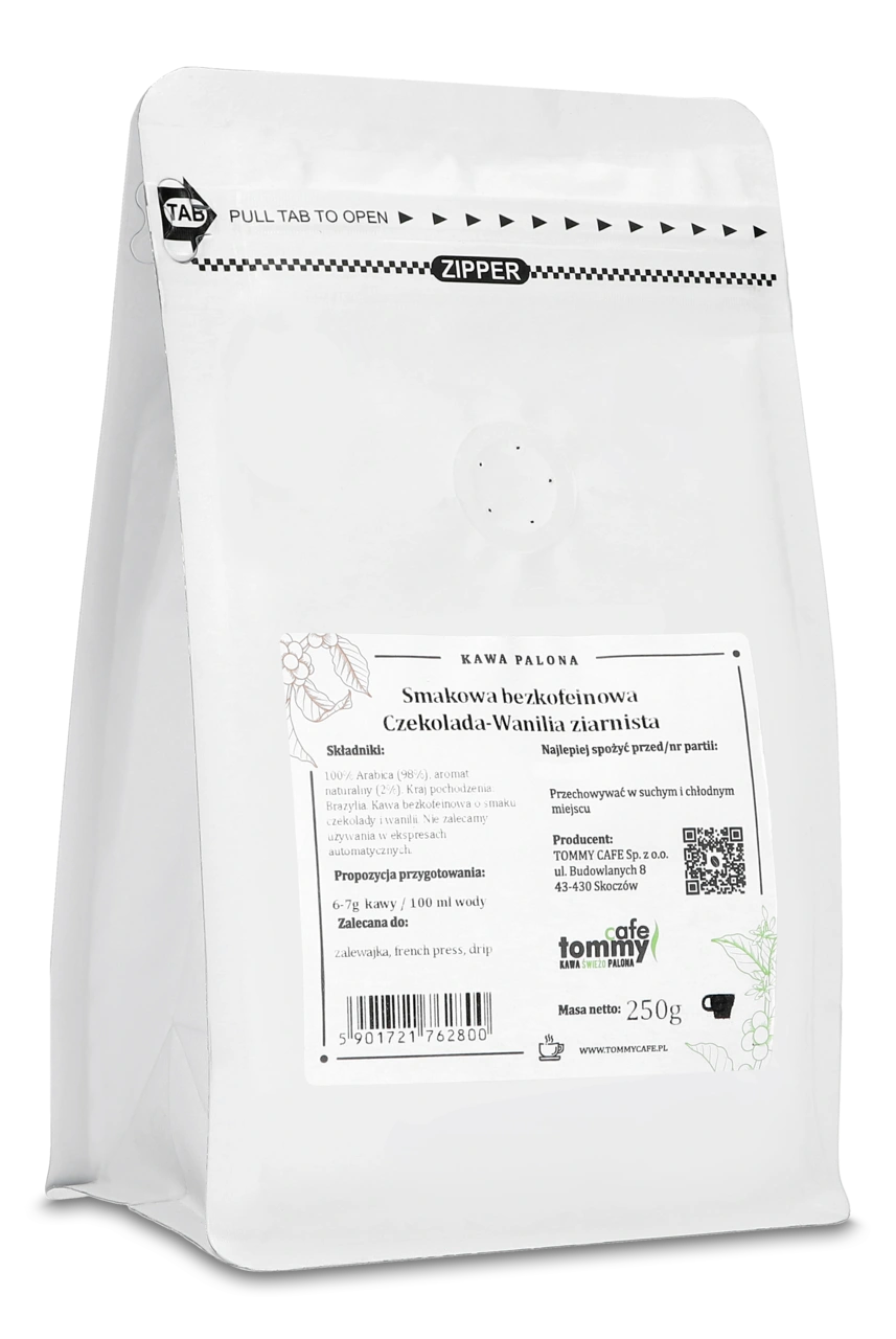 Kawa ziarnista bezkofeinowa smakowa Tommy Cafe Czekolada-Wanilia 250g